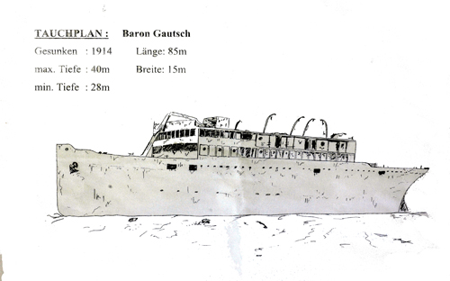 Tra i relitti più famosi dell’Adriatico settentrionale c’è sicuramente il relitto della nave passeggeri Baron Gautsch, proprio di fronte a Rovigno. La nave passeggeri austriaca, costruita nel 1908, affondò nella miniera nel 1914. Trasportava membri della famiglia di ufficiali austriaci sulla rotta di Boka Kotorska-Mali Lošinj-Trieste. Nel desiderio di abbreviare il tempo di viaggio, la nave ha tentato di passare attraverso la miniera 9 nm al di fuori di Rovigno perché quella via era presumibilmente poco prima di lui, e ha passato una nave mercantile.