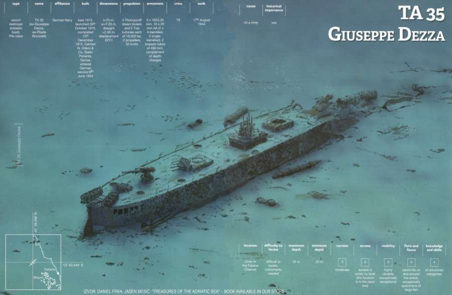 Nel 1929 fu nominato “Pilade Bronzetti”. Fu inondato da un aereo inglese che notò durante un normale volo scout. La torpediniera è dimezzata e l’arco e la poppa si trovano a circa 50 metri di distanza.