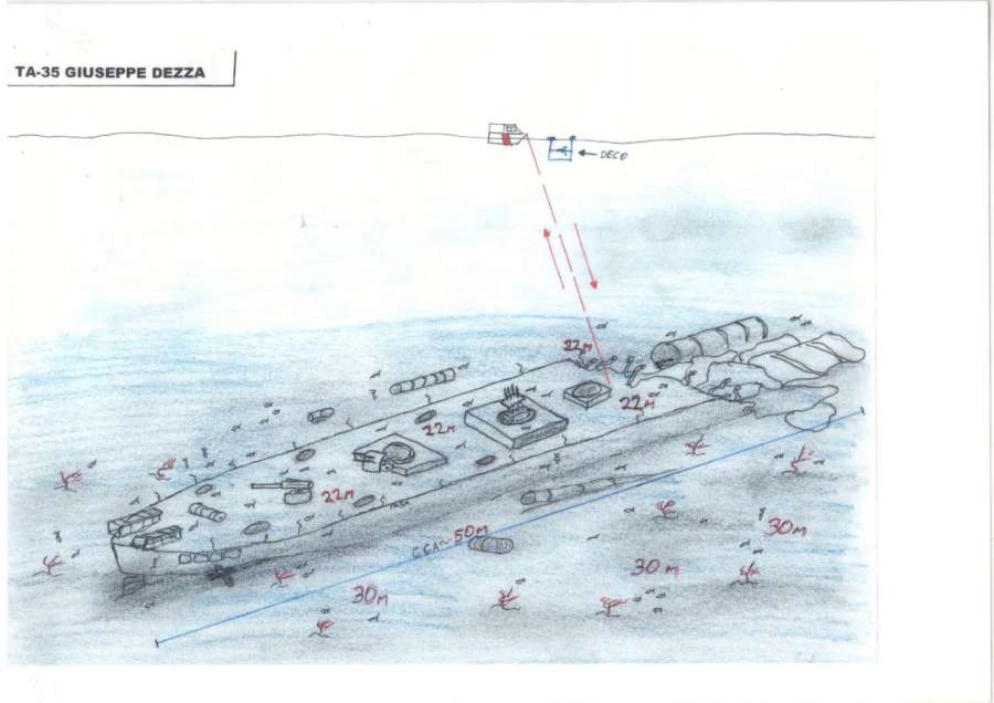 Giuseppe Dezza giace sul fondo del mare in una posizione adeguata con palle di corona ben viste e equipaggiamenti militari conservati e fermati nel tempo perduto.